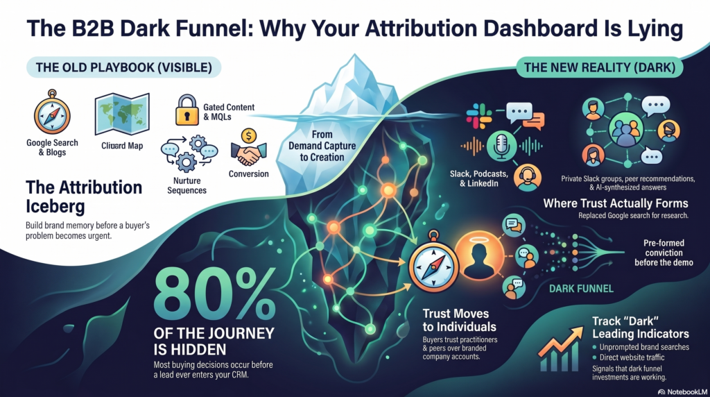 The dark funnel isn’t a failure of technology. You cannot instrument your way out of this. It’s a structural feature of how trust and attention work in markets where information is abundant, branded content is distrusted, and credibility is scarce. Buyers have developed immune responses to traditional marketing. They’ve built their own research ecosystems that route around it.